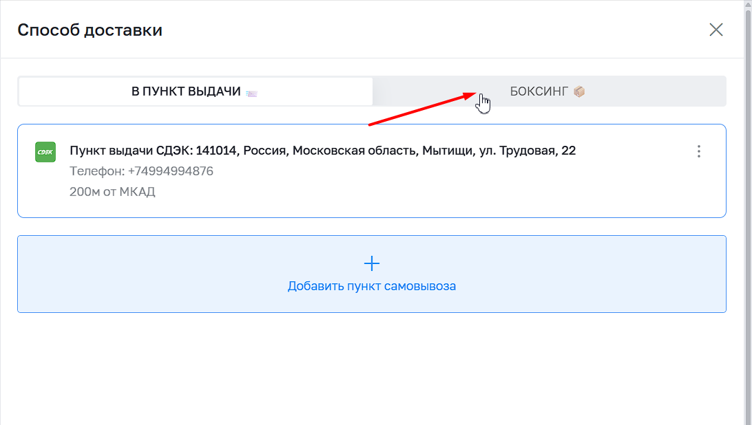 Нажмите изменить пункт выдачи и в меню выберите "БОКСИНГ". Укажите любой адрес и завершите оформление.