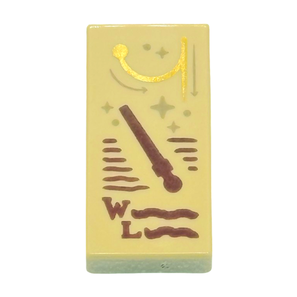 Плитка размером 1 х 2 дюйма с красновато-коричневой палочкой, заглавными буквами W, L и закорючками для заклинаний Wingardium Leviosa, темно-коричневыми блестками и стрелками, золотым узором в виде свиста и взмаха 3069pb1321